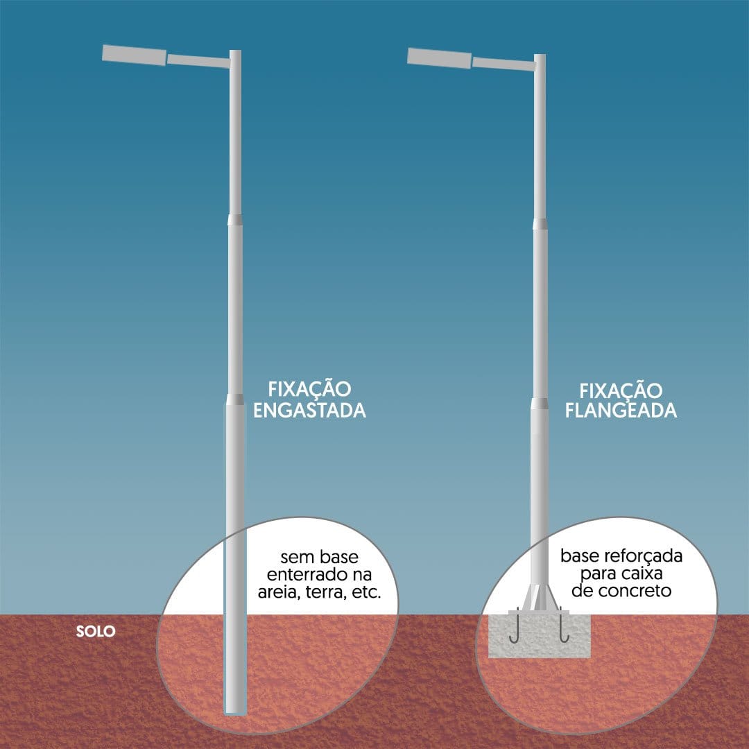 Também pode ser chamado de poste com base. Neste modelo de fixação o poste é fabricadocom uma base estrutural. Essa base tem furos especiais para permitir que o poste seja chumbado no solo. Para postes até 3 metros de altura a fixação é feita diretamente no piso, de concreto ou asfalto. Para poste com mais de 3 metros de altura há a necessidade de fazer uma caixa de concreto para sustentar adequadamento o poste. As medidas e a espessura do materail da base é proporcinal a altura do poste e da quantidade de luminárias que ele vai suportar. Essas dimensões também são determinadas na norma ABNT NBR 14744:2001, cujas especificações seguimos a risca.