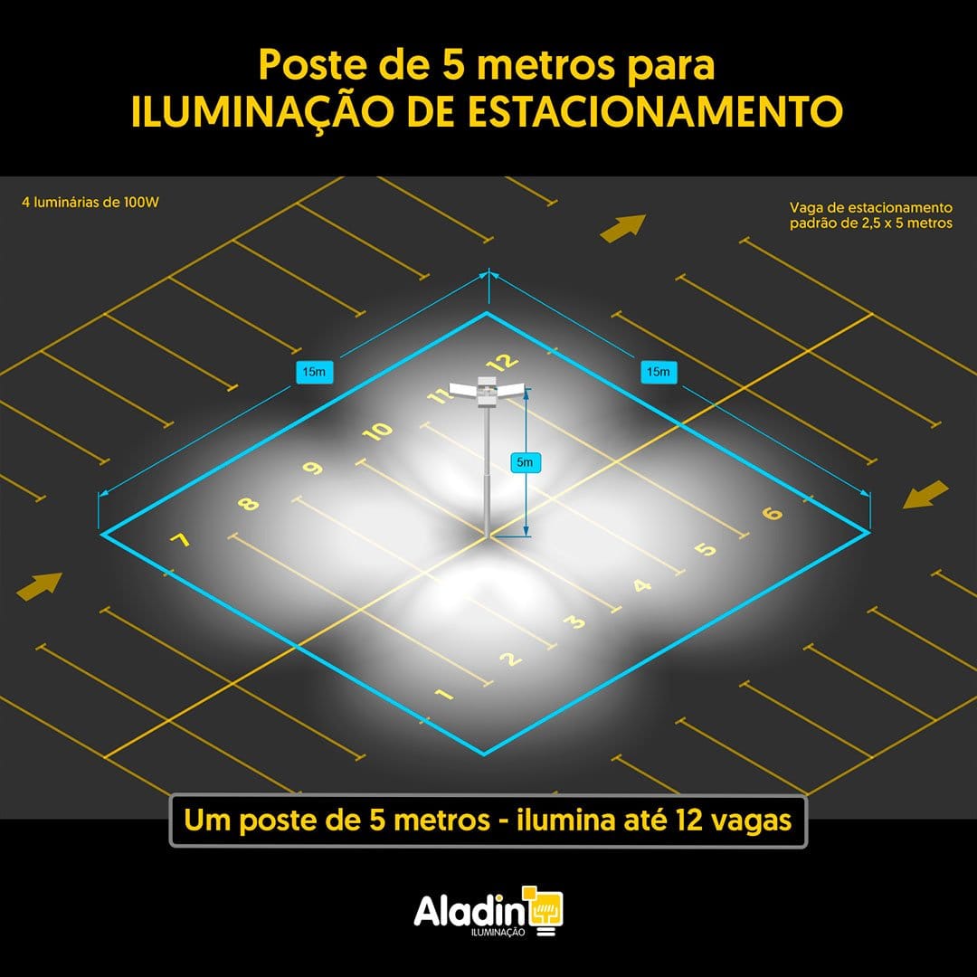 Um poste de 5 metros é capaz de iluminar 12 vagas de estacionamento.