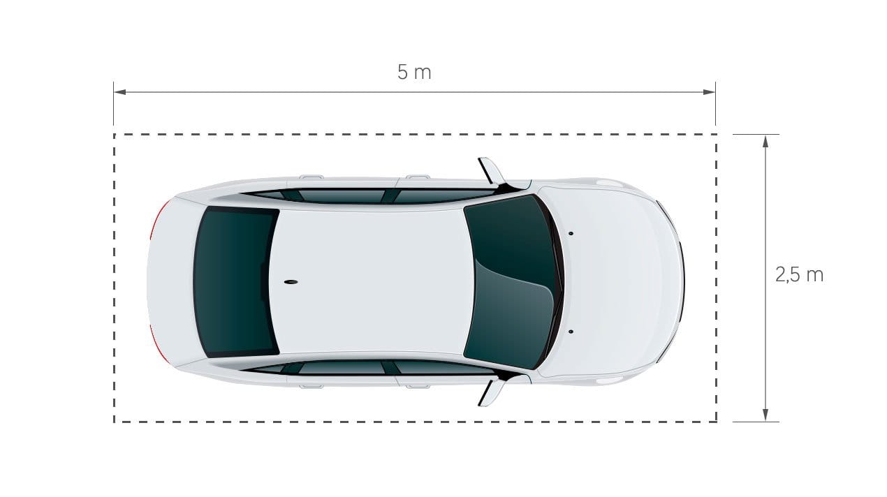 Para estabelecer quantas vagas um poste consegue iluminar, é preciso determinar o tamanho da vaga de estacionamento. Existem medidas padrão recomenadas para vagas de estacionamento. Como existem vagas de diversos portes (veiculos pequenos, médios e grandes) utilizamos dimensões médias aproximadas de 2,5 x 5 metros para cada vaga de estacionamento a 90° (perpendicular ao sentido da via de circulação do estacionamento).