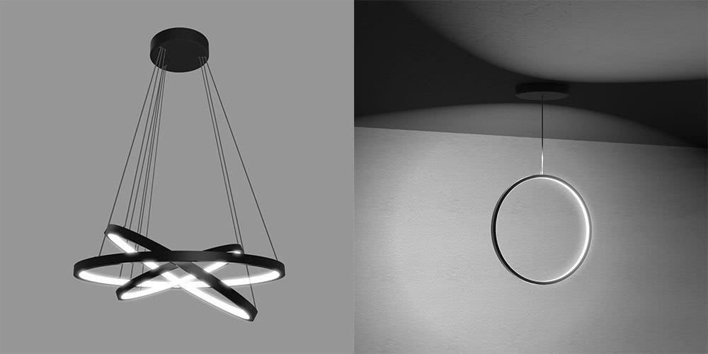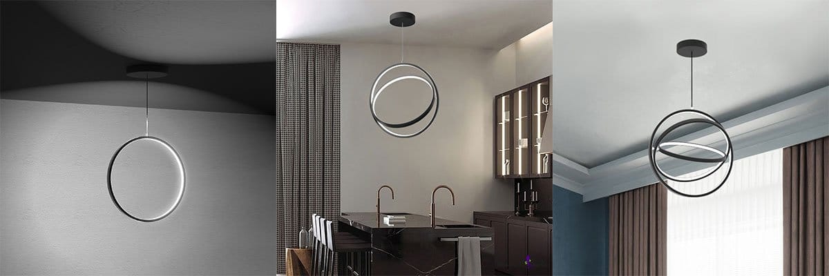 A Aladin Iluminação tem em sua linha de lustres 2 pendentes PD 360 (anéis verticais) PD 361 (anéis horizontais).