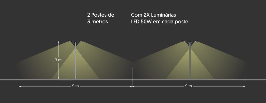 Utilizando 2 postes de 3 metros, com 2 luminárias de 50W em cada um e suportes inclinados, o alcance também é de 18 metros.