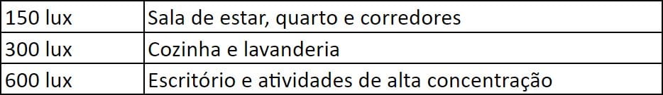 Existem normas que definem isso, uma delas é a ABNT NBR 5413 que especifica diversas atividades e seus respectivos níveis de iluminação recomendados (luminância ideal) entretanto, para simplificar, vamos resumir aqui algumas aplicações residenciais e comerciais/industriais separadamente.