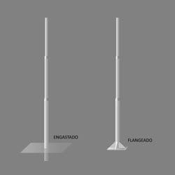 Um modelo básico e eficaz de poste metálico galvanizado que sugerimos é o PT 320, com opção de tamanhos de 3 a 12 metros, e de fixação no solo flangeado (solo rígido, concreto, asfalto, etc.), ou engastado (solo macio: areia, terra, etc.).