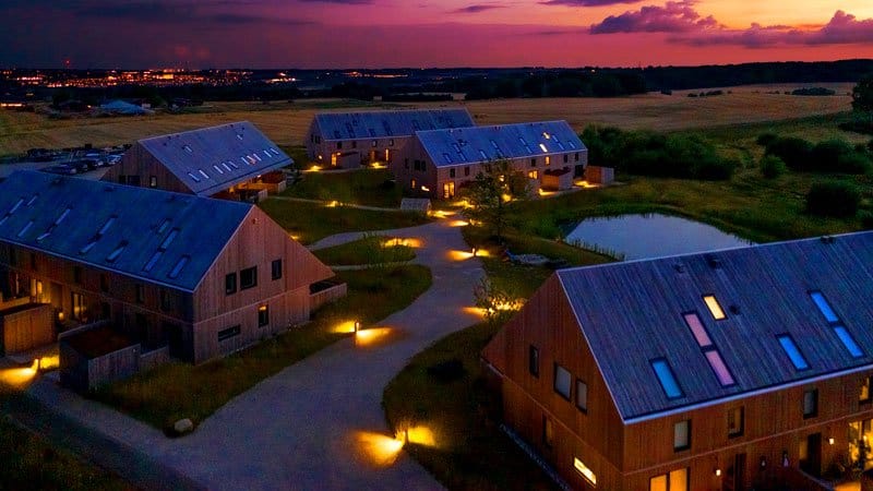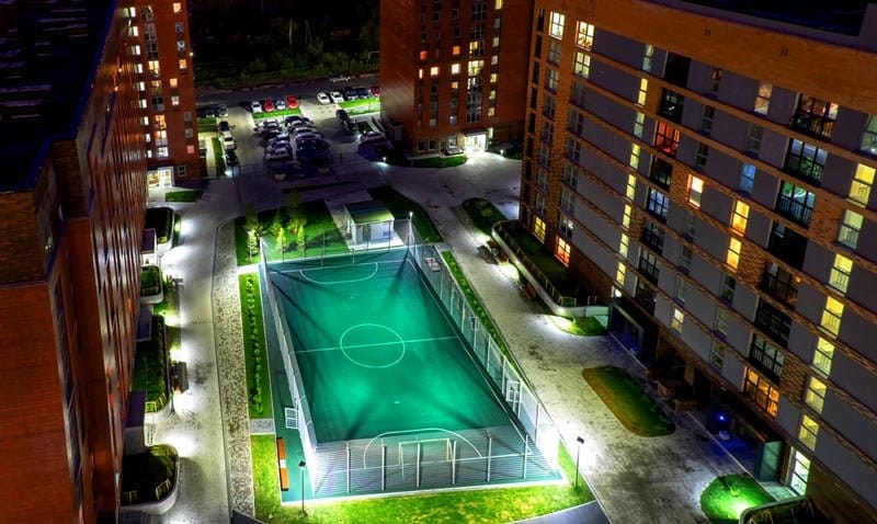 Como exemplo, uma área comum de condomínio com jardim e área de convivência e playground pode ser corretamente iluminada da seguinte maneira: