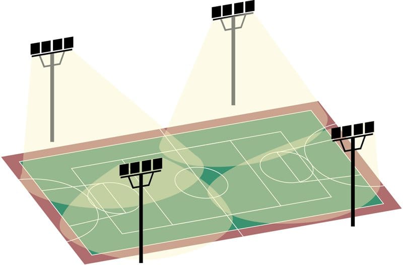 Como exemplo, uma quadra poliesportiva tamanho oficial (27x15m) pode ser corretamente iluminada da seguinte maneira: